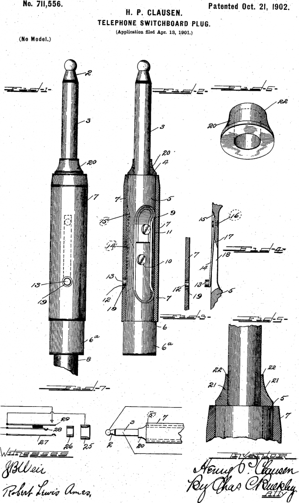Y con ese contexto en mente, el primer diseño presentado en una patente, en 1878, por Charles E. Scribner describía un «interruptor de resorte» utilizado en el funcionamiento de un cuadro de distribución. Presentaba una palanca conductora empujada por un resorte que actuaba como la hoja de un cuchillo, (jack-knife). Cuando un enchufe del cable hacía contacto con la palanca, giraba y rompía su conexión con otro contacto, de forma similar a cómo se abre y cierra una navaja de bolsillo. Debido a este parecido, el receptáculo que sujetaba la palanca recibió el sobrenombre de «jack-knife», y finalmente se redujo a simplemente «Jack».